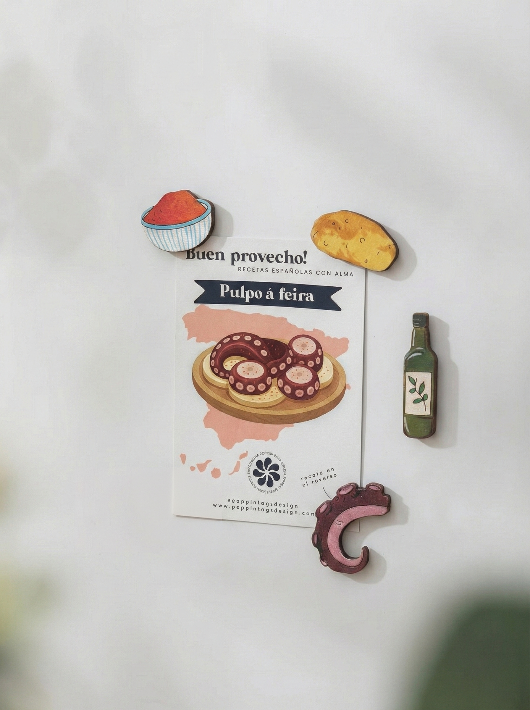 Bring the warmth of Spanish home cooking into your kitchen with Poppin’ Tags Design’s Spanish recipe magnets. Inspired by four iconic dishes from different corners of Spain, each set features FSC-certified wooden magnets paired with an illustrated recipe card that guides you step by step.